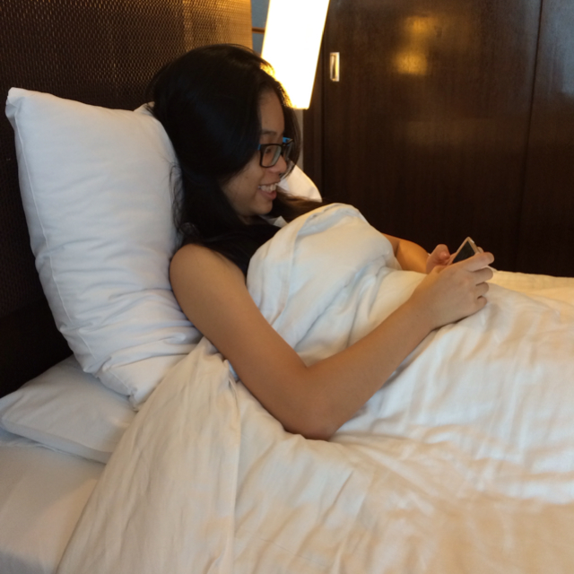 As soon as she came out, go rest comfortably on the bed playing her game.